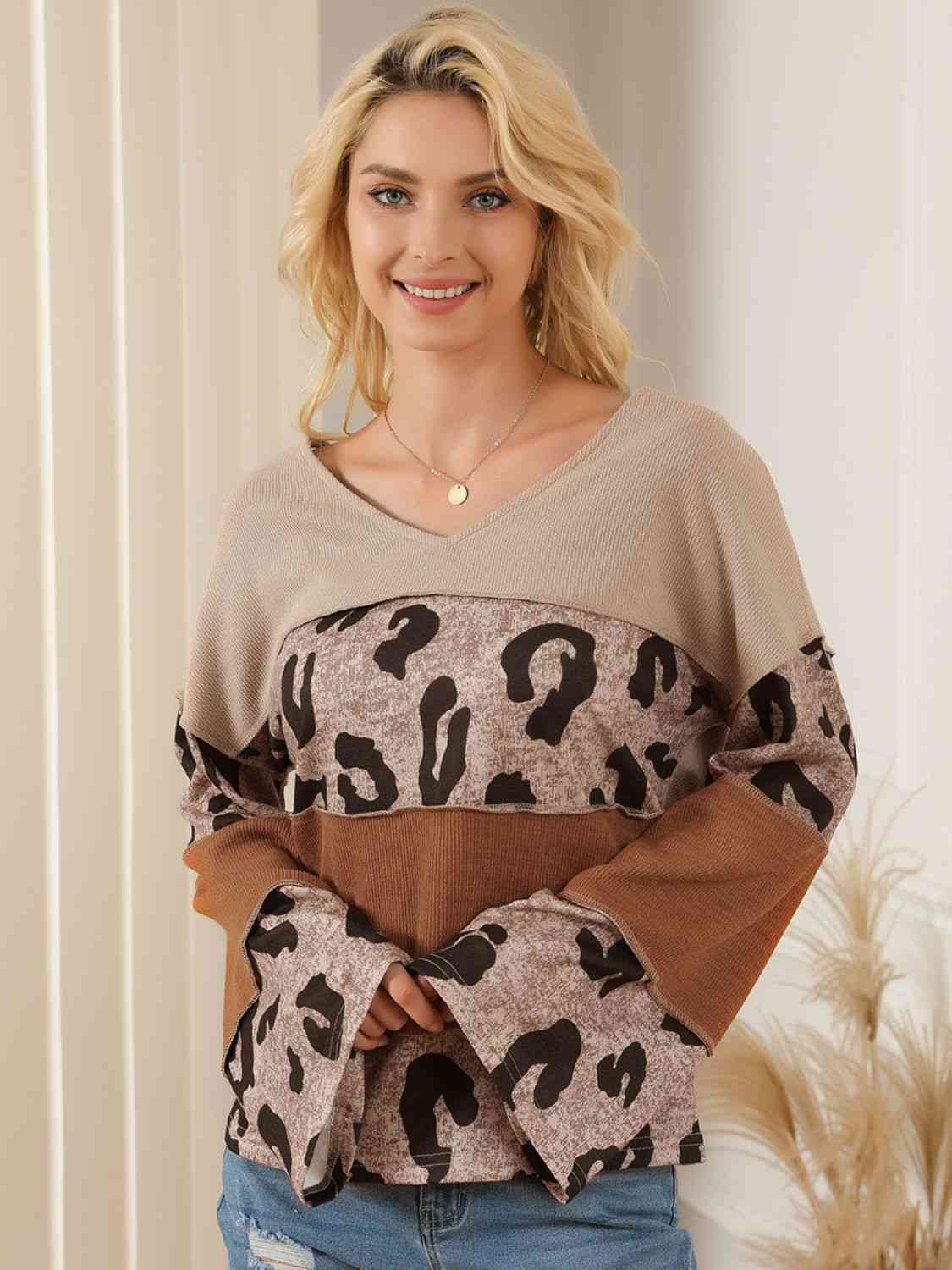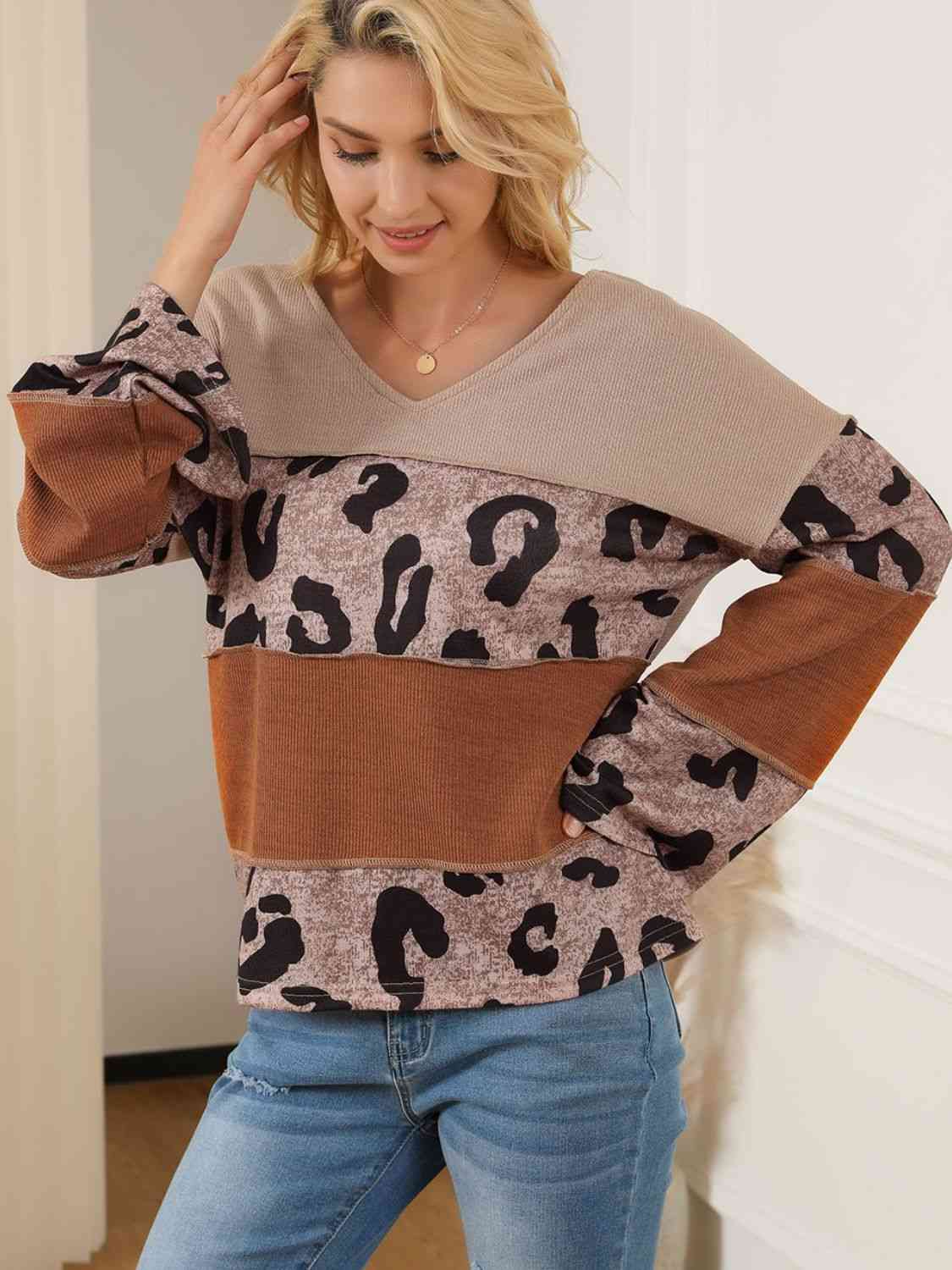 Color Block Leopard V-Neck Blouse