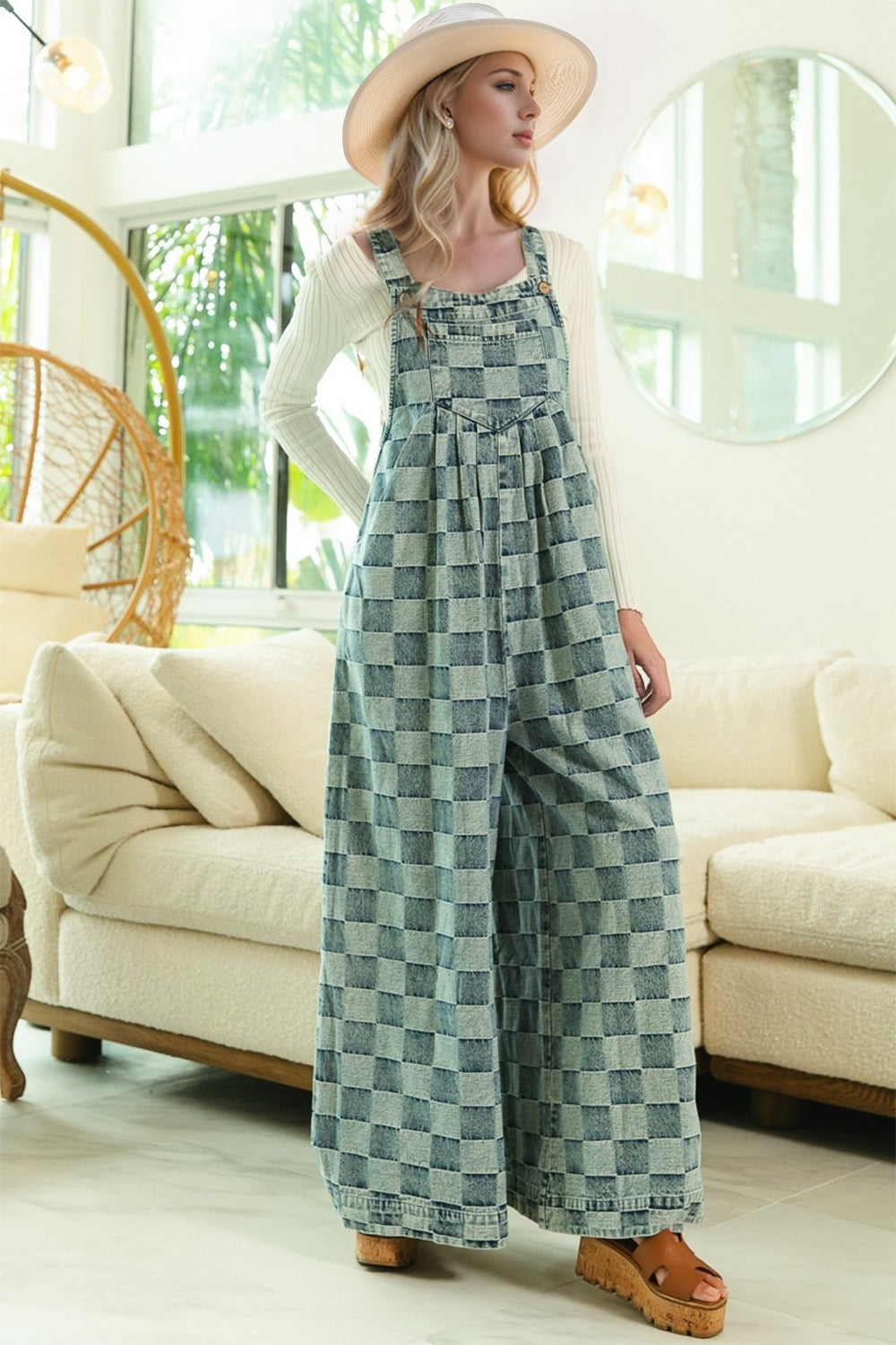 Double Take Checkered Sleeveless Wide Leg Denim Jumpsuit